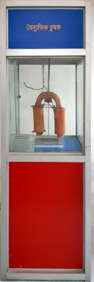 এই প্রদর্শনীবস্তুটি তড়িচ্চুম্বক এবং এটাকে কিভাবে তৈরি করা হয় তা প্রদর্শন করে। যখন সলিনয়েডের মধ্য দিয়ে একমুখী বিদ্যুৎ প্রবাহ (ডি.সি.) চালনা করা হয়, তখন সলিনয়েডটি দন্ড চুম্বকের ন্যায় আচরণ করে। যদি সলিরয়েডটির আকার অশ্বের খুরের মত হয়, তবে সলিনয়েডটি অশ্ব খুরাকৃতি চুম্বকের ন্যায় আচরণ করে। বিদ্যুৎ প্রবাহ অপসারণ করলে সলিনয়েডটিতে কোন চুম্বকত্ব থাকে না। যদি সলিনয়েডটির অভ্যন্তরদেশ নরম লোহা দ্বারা পূর্ণ করা হয়, তবে চুম্বকের শক্তি বৃদ্ধি পায়। তড়িচ্চুম্বকের মেরুত্ব বিদ্যুৎ প্রবাহের দিক কর্তৃক নিণীত হয়। সলিনয়েডের প্রান্তের মধ্য দিয়ে পর্যবেক্ষণে যদি বিদ্যুৎ প্রবাহ ঘড়ির কাটার বিপরীত মুখী হয়, তবে ঐ প্রান্তটি উত্তর মেরু হবে। অন্যভাবে সলিনয়েডের প্রান্তের মধ্য দিয়ে পর্যবেক্ষণে যদি বিদ্যুৎ প্রবাহ ঘড়ির কাটার সমমুখী হয়, তবে ঐ প্রান্তটি দক্ষিণ মেরু হবে। সংক্ষিপ্ত ইতিহাস: ১৮২০ সালে ডেনিশ বিজ্ঞানী হান্স ক্রিস্টিয়ান ওয়েরস্টেড আবিষ্কার করেন যে বৈদ্যুতিক প্রবাহ চৌম্বক ক্ষেত্র সৃষ্টি করে। ১৯২৪ সালে ব্রিটিশ বিজ্ঞানী উইলিয়াম স্টার্জিয়ন তড়িচ্চুম্বক তড়িচ্চুম্বক উদ্ভাবণ করেন। তাঁর প্রথম তড়িচ্চুম্বকটি একটি অশ্বখুরাকৃতি লোহার খন্ড যা প্রায় ১৮ পাকের নগ্ন (সেকালে অপরিবাহীর আচ্ছাদনের প্রচলন ছিল না) তামার তারে আচ্ছন্ন করা হয়েছিল। পাকীয় আচ্ছাদন বিছিন্ন করতে লোহার উপর বার্ণিশ করা হয়েছিল। যখন কুণ্ডলীটির মধ্যদিয়ে কোন বৈদ্যুতিক প্রবাহ পাঠানো হত, তখন লৌহটি চুম্বকে পরিণত হত, এবং অপরাপর লৌহের টুকরা আকর্ষন করত; যখন বৈদ্যুতিক প্রবাহ বন্ধ করা হত, এটা চুম্বকায়ন হারিয়ে ফেলত। যদিও এটি মাত্র সাত আউন্স (প্রায় ২০০ গ্রাম) ওজন উঁচিয়ে স্টার্জিয়ন এর ক্ষমতা প্রদর্শন করেছিলেন, এটি ৯ পাউন্ড (প্রায় ৪ কিলোগ্রাম) ওজন উত্তোলনে সক্ষম হয়েছিল যখন একক-কোষ ব্যাটারি থেকে বৈদ্যুতিক প্রবাহ প্রযুক্ত হয়। যাইহোক, স্টার্জিয়নের চুম্বক দুর্বল ছিল কারণ তাঁর ব্যবহৃত অনাচ্ছাদিত তার কোরের চতুর্দিকে শুধুমাত্র একক স্তরের আচ্ছাদন দিতে পেরেছিল, যা পাক সংখা সীমিত করেছিল। ১৮২৭ থেকে শুরু করে, মার্কিন বিজ্ঞানী জোসেফ হেনরি ধারাক্রমে উন্নত করেন এবং তড়িচ্চুম্বককে জনপ্রিয় করেন। সিল্ক সুতা দ্বারা আচ্ছাদিত তার ব্যবহার করে তিনি কোরের চতুর্দিকে একাধিক স্তর তারের আচ্ছাদন দিতে সক্ষম হয়েছিলেন, এভাবে সহস্র সহস্র পাকের শক্তিশালী চুম্বক তৈরি করেছিলেন, এর মধ্যের একটি ২০৬৩ পাউণ্ড (৯৩৬ কেজি) উত্তোলনে সমর্থ হয়েছিল। তড়িচ্চুম্বককের প্রথম প্রধান ব্যবহার ছিল টেলিগ্রাফের সাউন্ডারে। ফেরোম্যাগনেটিক কোর কিভাবে কাজ করে, এর উপর সর্বপ্রথম ১৯০৬ সালে ফরাসি পদার্থবিজ্ঞানী পি