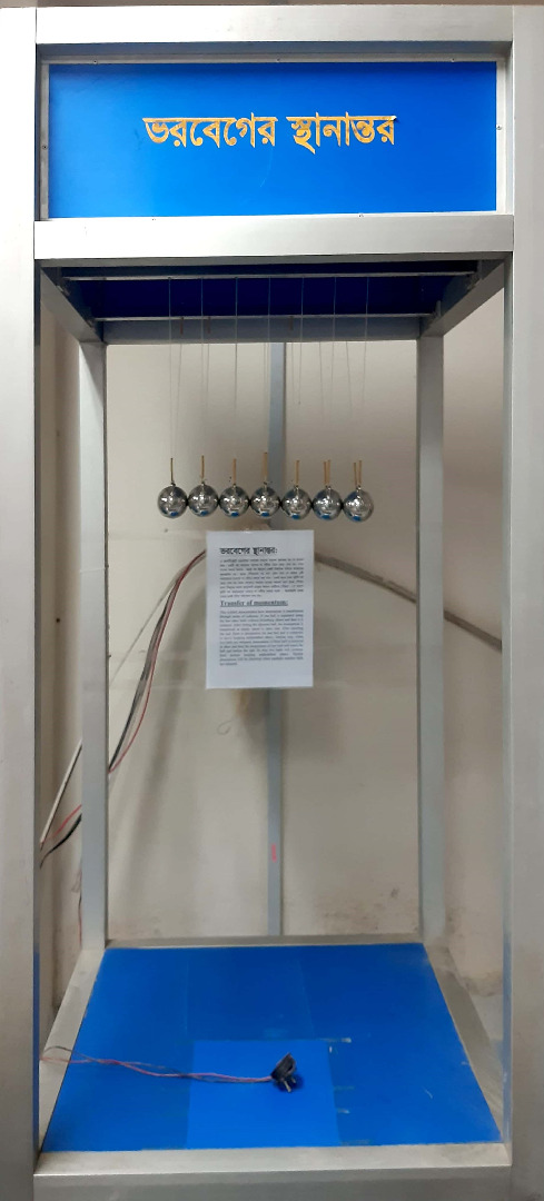 This exhibit demonstrates how momentum is transformed through series of collisions. This is a large version of a popular executive toy called Newton’s Cradle. According to various sources, English actor Simon Prebble invented this device in 1967 and named it in honour of Isaac Newton, whose laws it obeys and demonstrates so nicely. It is also known to some as Newton’s Balls. If one ball is separated along the line other balls without disturbing others and then it is released. After hitting the adjacent ball, the momentum is transferred at steady speed [just like propagation of wave though material media] to other end. After reaching the end, there is obstruction for the end ball and it continues to move keeping undisturbed others. Similar way, when two balls are released, when momentum of front ball is received at other end then the momentum of rear ball will reach the ball just before the end. So why two balls will continue their motion keeping undisturbed others. Similar phenomena will be observed when multiple number balls are released. So this apparatus demonstrates conservation of momentum and energy in an interesting way.