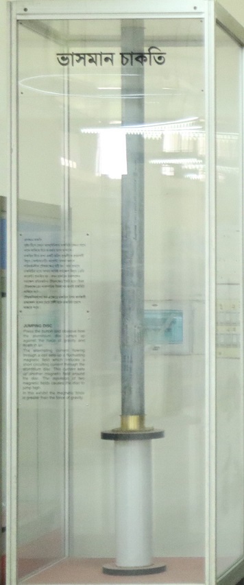 প্রদর্শনীবস্তুটির সুইচ টিপ দিলে দেখা যাবে অ্যালুমিনিয়াম চাকতিটা সাথে সাথে লাফিয়ে উঠে হাওয়ায় ভাসতে থাকে।