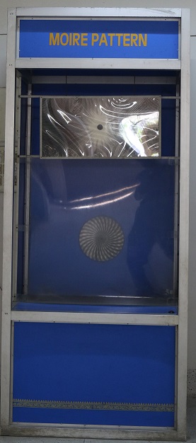 In physics the geometrical design that results when a set of straight or curved lines is superposed onto another set the name derives from a French word for watered. The effect may be seen by looking through the folds of a nylon curtain of small mesh or two sheets of graph paper twisted 20 r 30 degrees with respect to one another. If a grating design made of parallel black and white bars of equal width is superposed on an identical grating moiré fringes will appear as the crossing angle is varied from about one second of arc to about 45°.This principle is used to measure small displacements in mechanical devisees (e.g. cooperation).Moiré patterns are useful in representing fluid flow and potential fields problems in optics ,wave motion, stress analysis crystallography, mathematics and the psychology of perception may also be solved. A different kind of moire pattern results when two families of curves of different colors are superposed fringes of a third color are produced