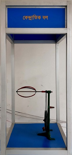 This exhibit demonstrates centrifugal force. Centrifugal force is such force, which acts outward from the centre of rotation of a rotary body. Centrifugal force is arisen from the reaction of centripetal force according to Newton’s third law force pair. So like centripetal force, centrifugal force is proportional to mass and square of tangential velocity and inversely proportional to radius of rotation. When the rotor of the exhibit is rotated, then the object attached to it is shrink along the axis and inflated in equatorial zone due to centrifugal force. That is why; the earth is inflated of her equatorial zone. Consequently, it is thought that once upon a time the earth was molten. Centrifugal force is used in our daily life for different purposes like as: to churn up butter from milk. The conception of centrifugal force has evolved since the time of Huygens, Newton, Leibniz, and Hooke who expressed early conceptions of it. The modern conception as a fictitious force or pseudo force due to a rotating reference frame as described above evolved in the eighteenth and nineteenth centuries.