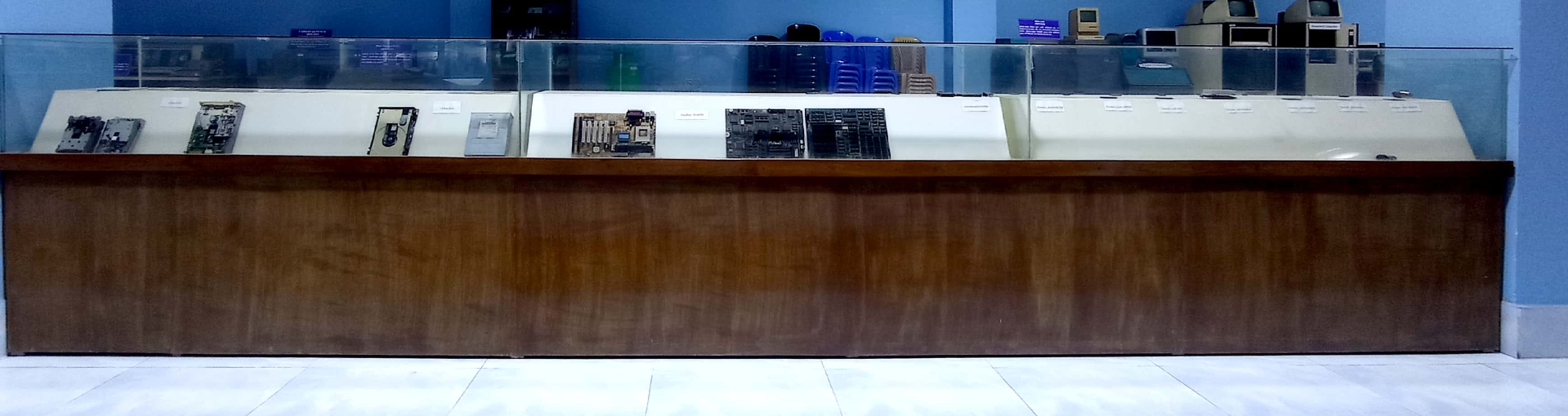 Various hardware of the computers of different time is presented in the transparent box. The contents are given bellow: