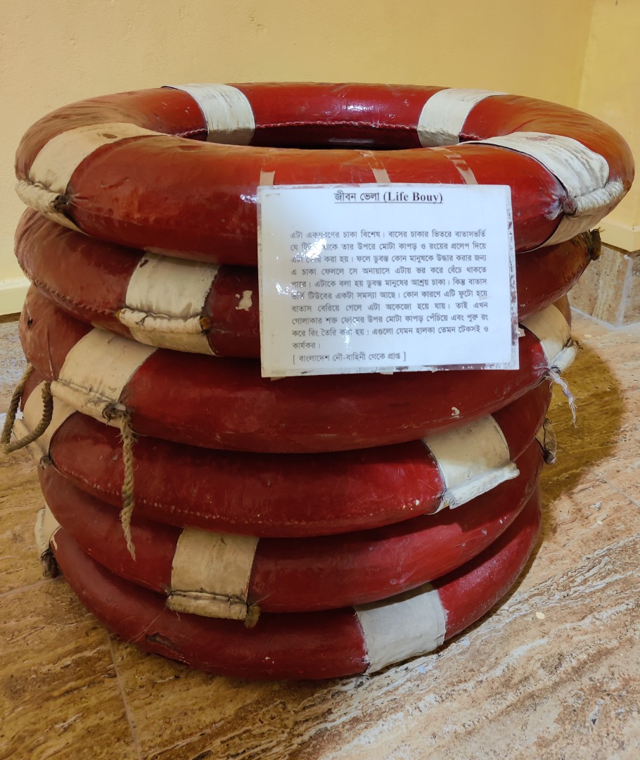 It is a closed loop circular tube containing air. In earlier days it was done by colouring on wrapped canvas over a air filled tube of bus wheel. A downing man can easily survive by supporting on it. But it has a great problem due to leakage as trapped air can escape from the tube. So th resolve the problem the air filled tube is manufactured by a rigid metallic frame. The object is coloured thickly for better performance (collected form Bangladesh Naval Force.