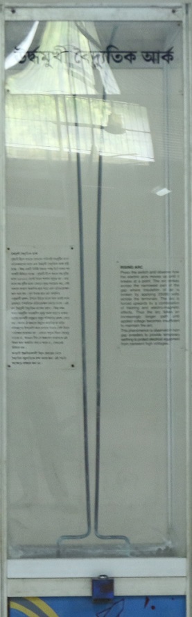 Press the switch and observe how the electric arcs moves up until it breaks at a point .The arc strikes across the narrowest part of the gap where insulation of air is broken by applying 25000 volts across the terminals. The arc is forced upwards by a combination of heating and electro-magnetic effects. Thus the arc takes an increasingly longer path until applied voltage becomes in sufficient to the arc.This phenomenon is observed in horn gap arresters to provide temporary earthing to protect electrical equipment from transient high voltages.